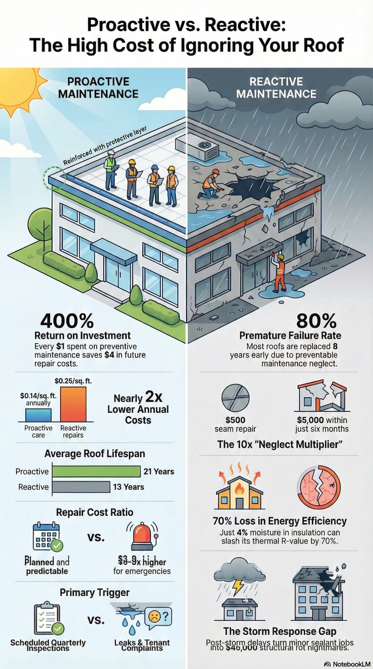 One of the most common and valuable uses for FLIR drone imaging is commercial roof inspection. Large flat roofs often present significant challenges for visual-only assessment. Problems beneath the surface may not be obvious until damage becomes more severe or more expensive to address. Moisture trapped within insulation or membrane systems can create thermal anomalies that show up under the right conditions during a properly planned FLIR inspection flight.
